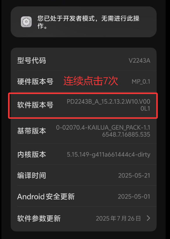 设置 - 关于手机 - 版本信息 - 疯狂点击软件版本号7次