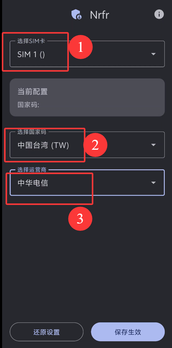 选择SIM 1,国家码选择一个TikTok支持地区(⚠️香港和澳门已不支持TikTok服务!),点击“保存生效”