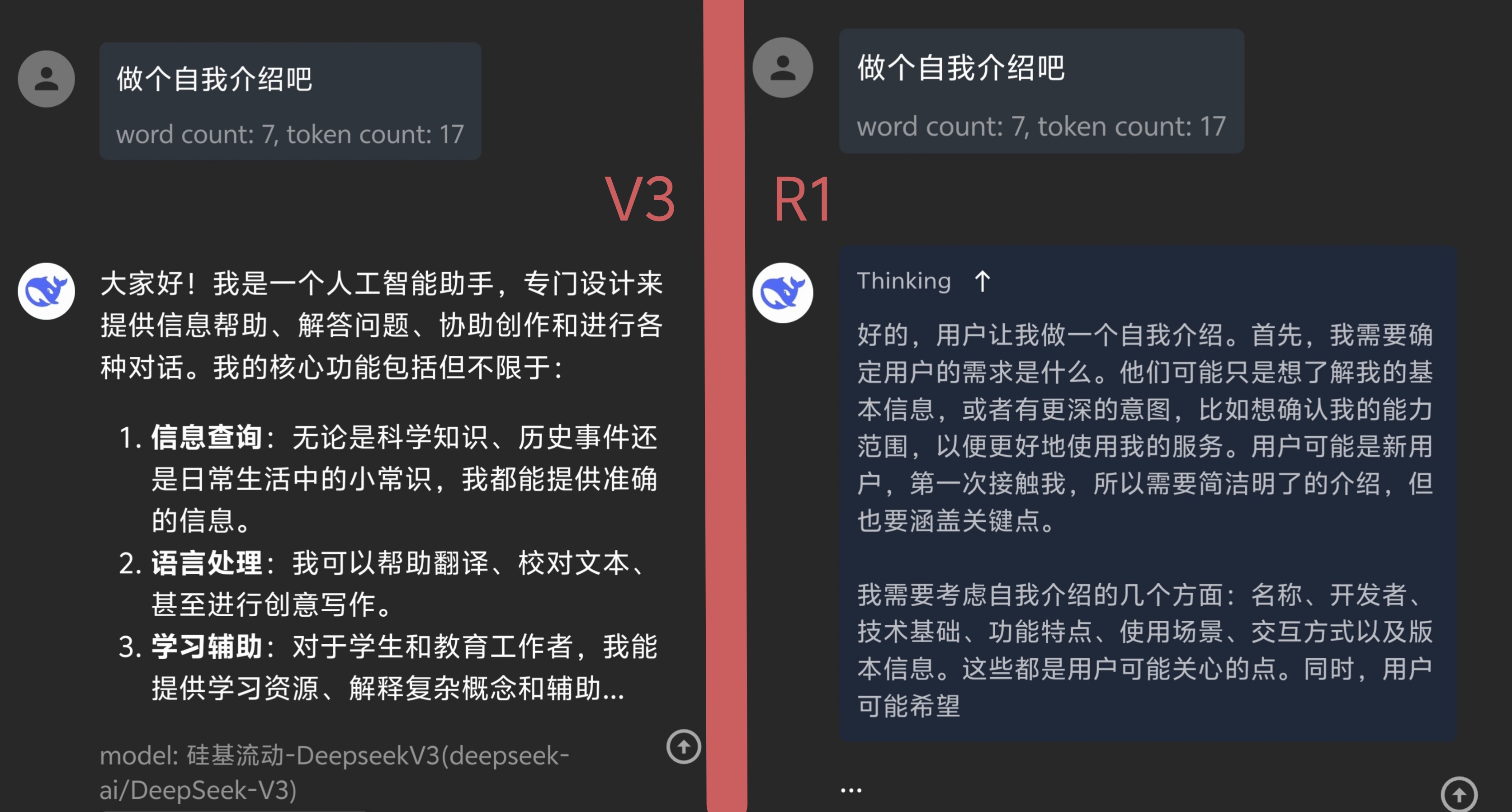 V3就是我们在官方客户端上未开启深度思考的,而R1则是开启了深度思考的,输出内容的同时会包含思考过程