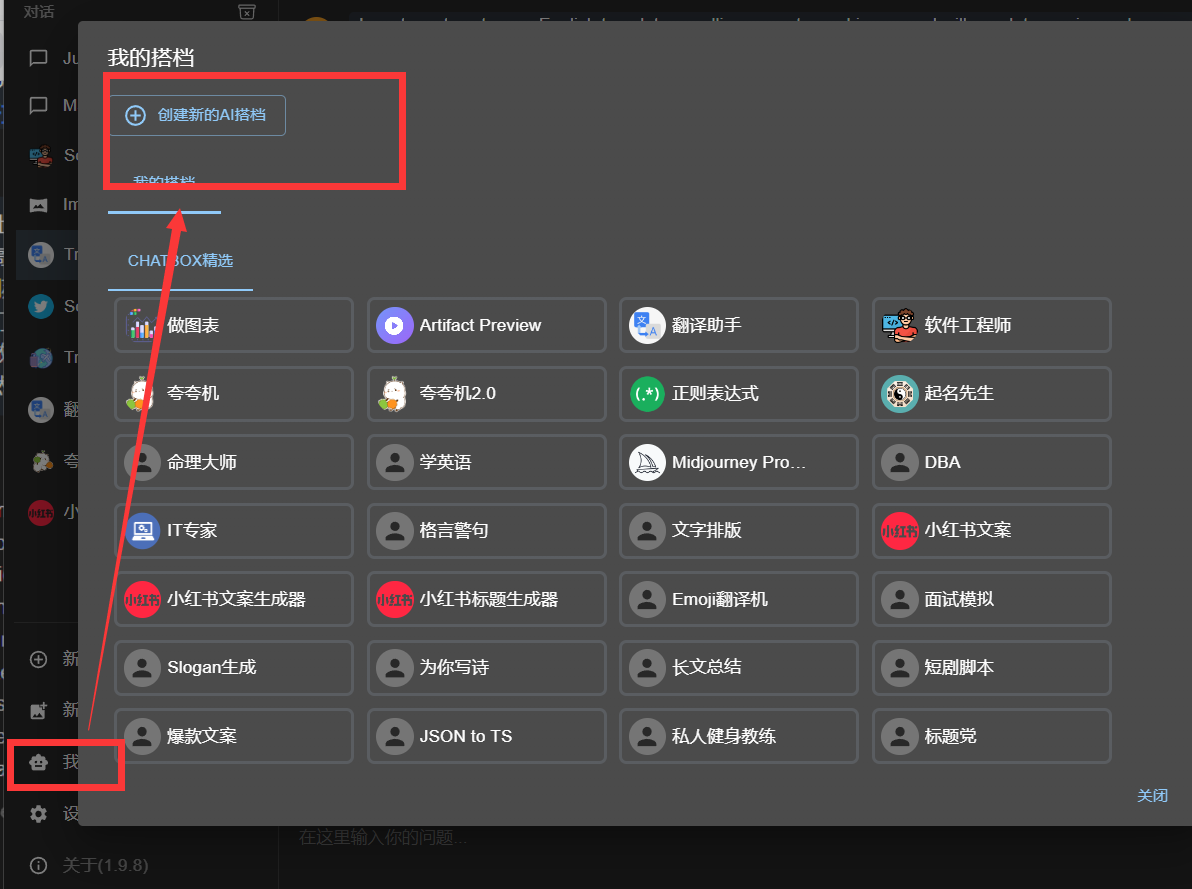 点击 我的搭档,可以看见这里CHATBOX官方已经有很多AI 角色预设,这里我们可以选择自己创建一个
