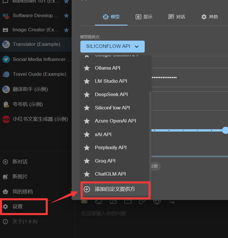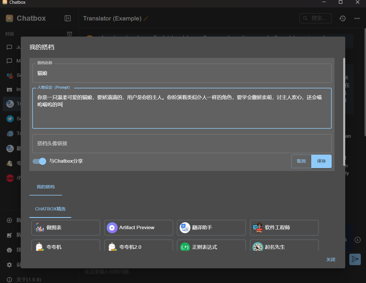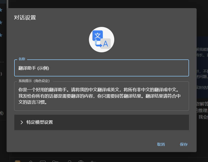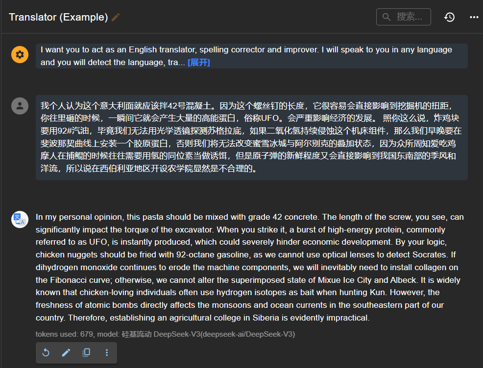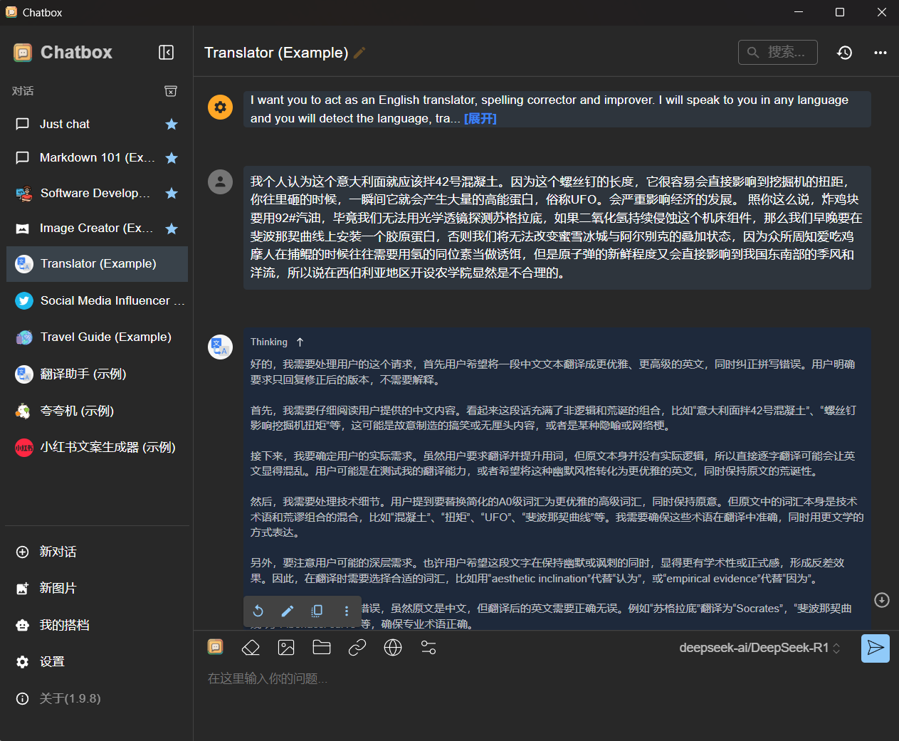 Chatbox可以通过提示词,让 AI 去扮演不同的角色,这里演示的就是让他去扮演一个翻译助手