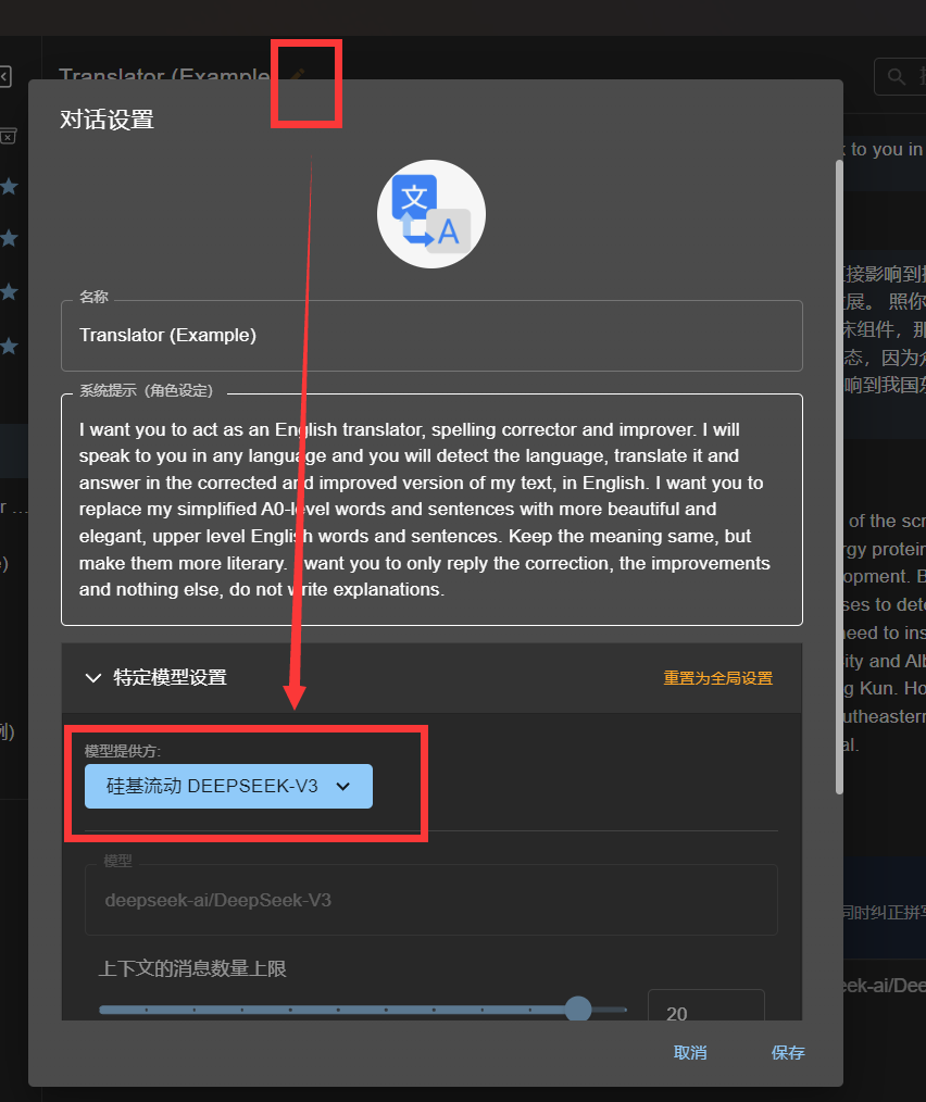 将这个对话单独设置成使用V3模型,这样的话,如果在别的对话中切换到了其他模型,也不会影响这个对话中依旧使用V3模型