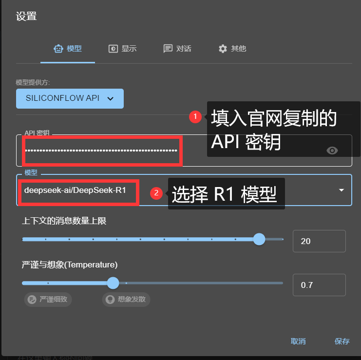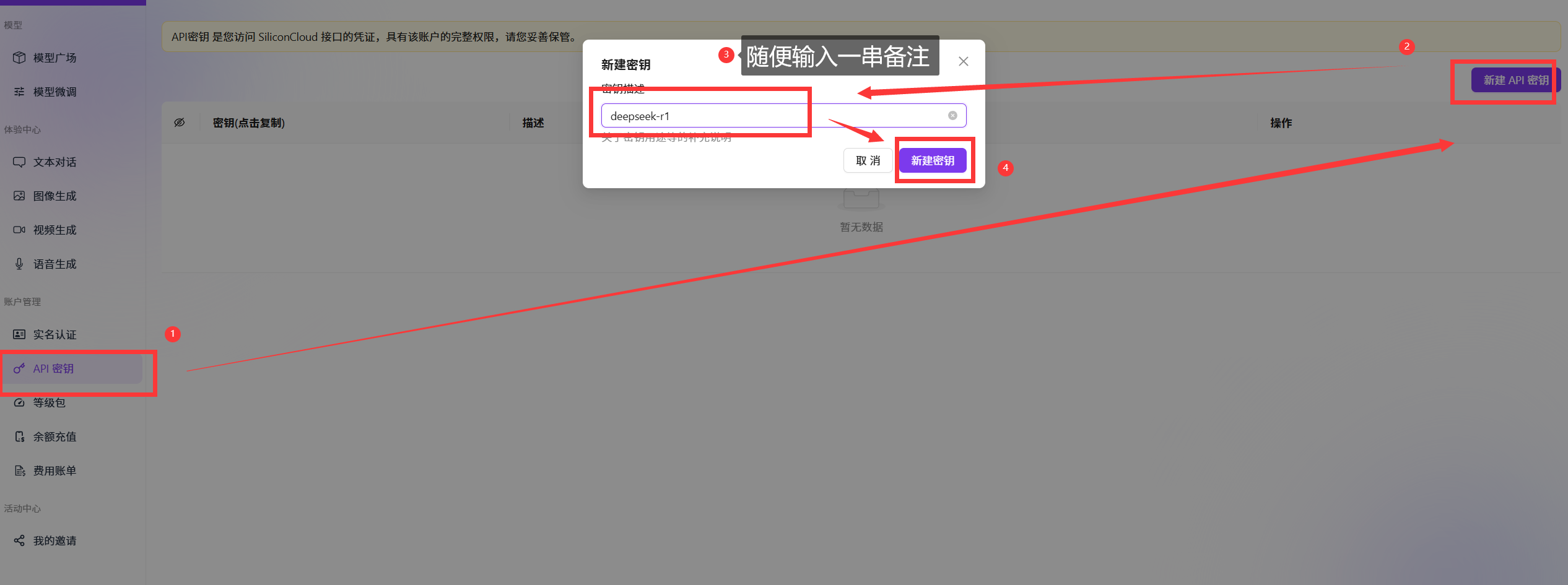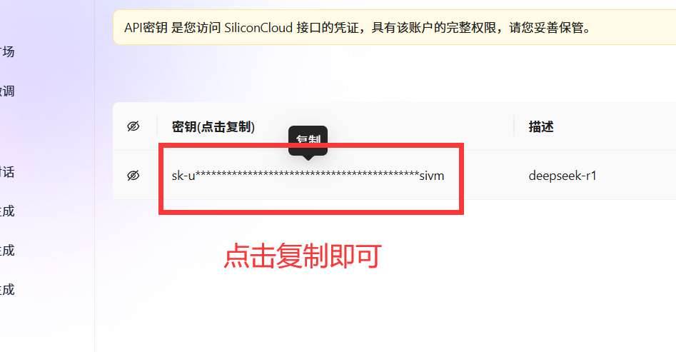 API 密钥:填写在 SiliconCloud 后台新建的 API 密钥