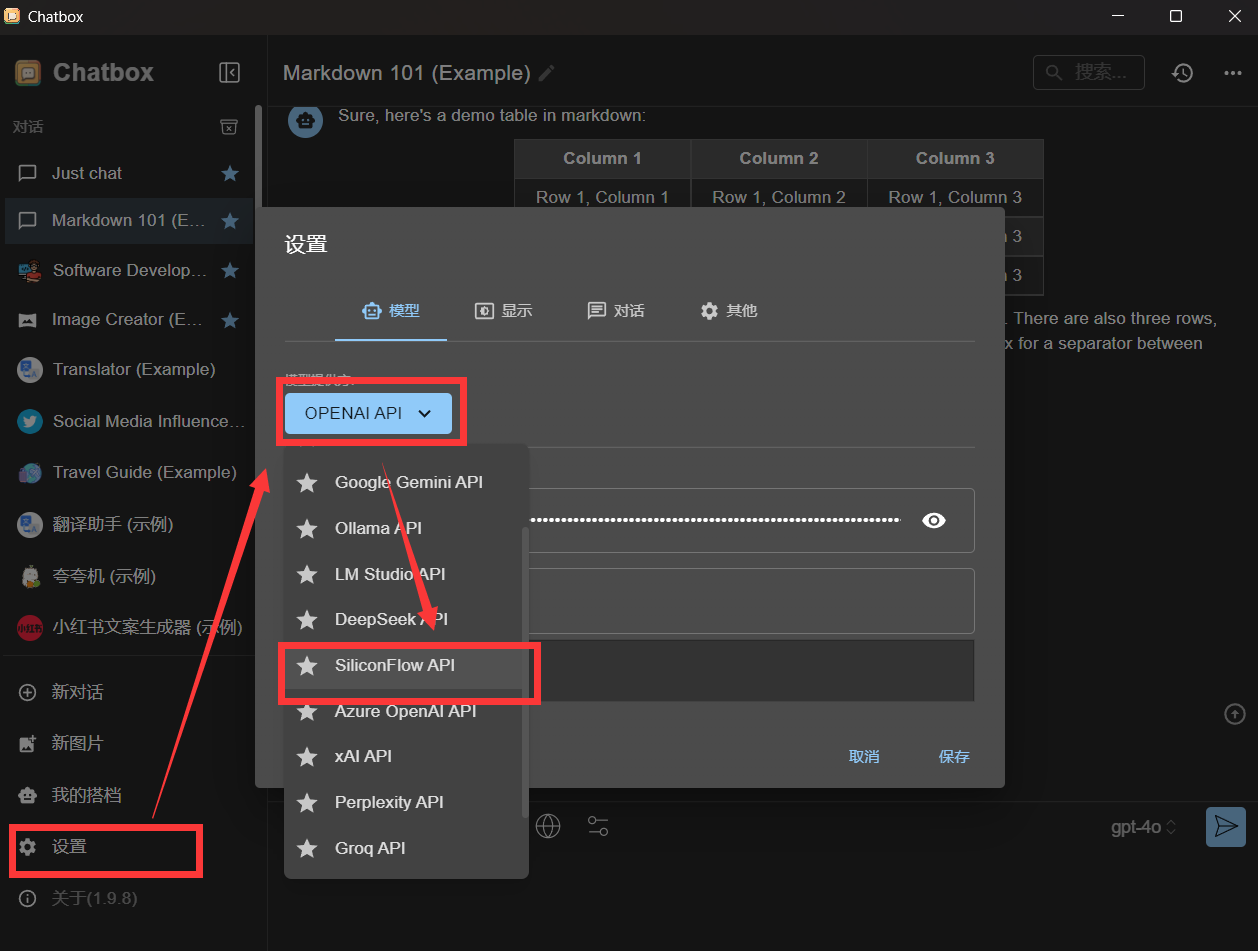 进入后点击 设置-OPENAI API-切换成“SiliconFlow API”(即硅基流动 API)