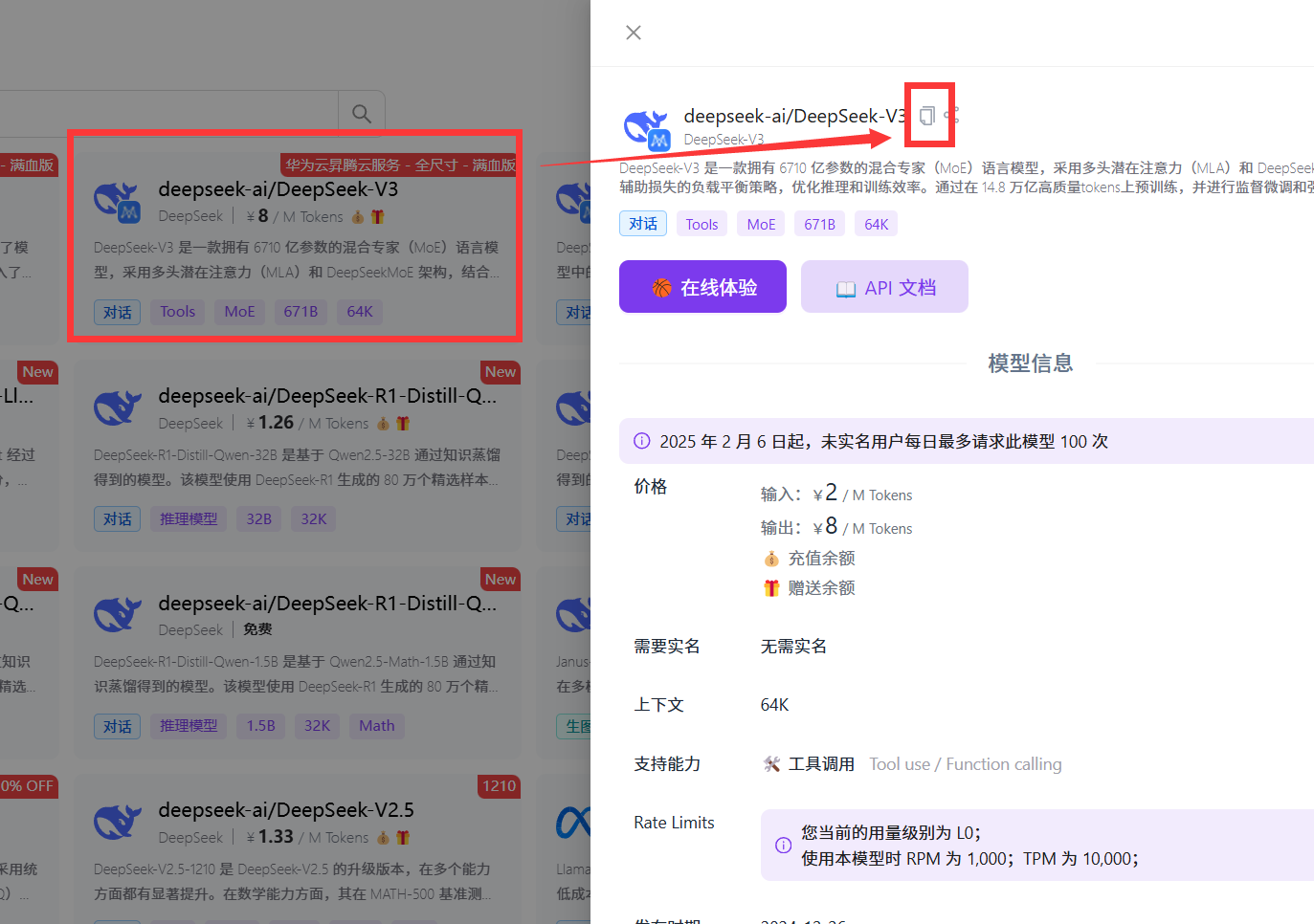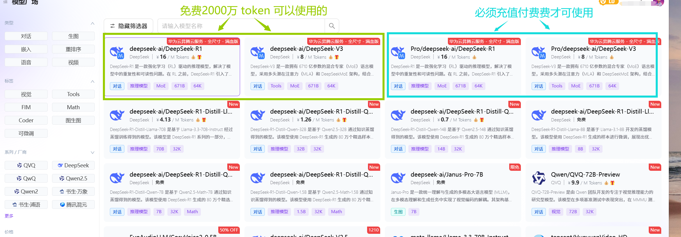 左边绿色是没有充钱的免费用户可以通过免费2000万 token 直接使用的模型接口,右边则是必须要充值余额才可以使用的项目。两边的 AI 模型都是完整满血版,只不过在用户使用量上存在差异,免费版的可能会比付费版的稍微卡一点。不过相对于官方的体验还是会好很多。