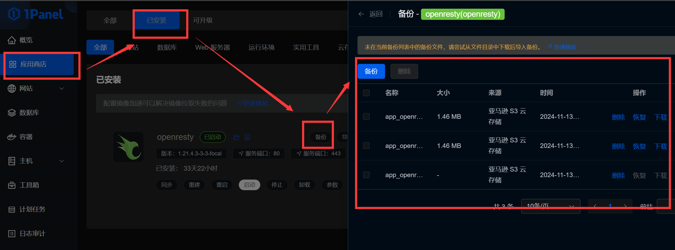 在应用商店处我们可以看到历史备份,进行选择恢复