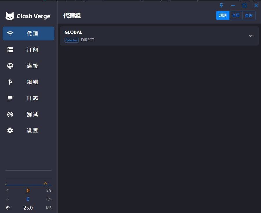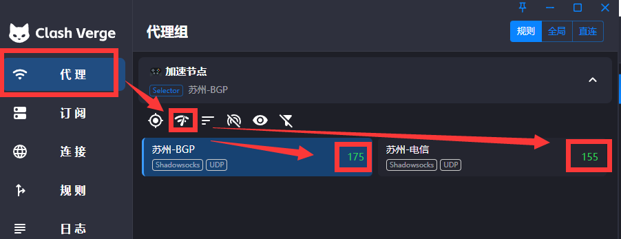 点击左侧“代理”栏目,点击测速按钮,如果节点有显示出数字,则证明节点可用,一般我们优先选择 BGP 或者与自己本地网络相同运营商的节点