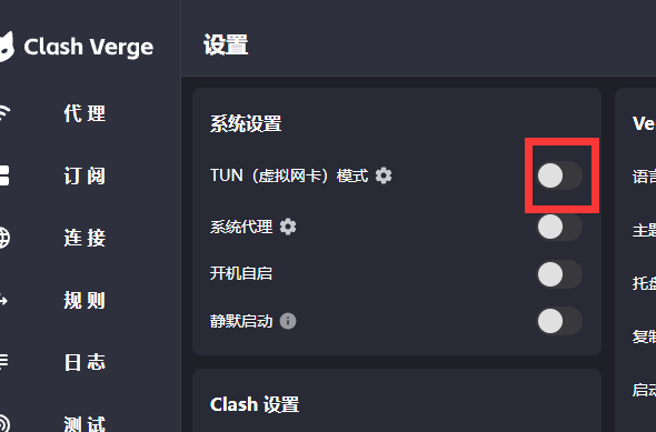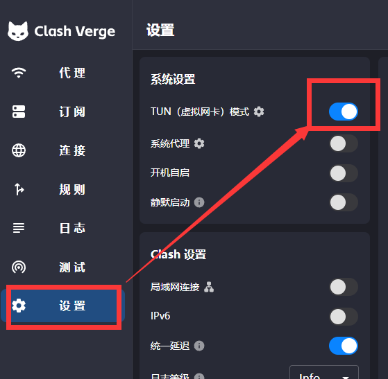 点击左侧“设置”栏目,开启 TUN(虚拟网卡)模式